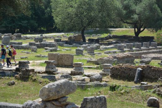 die ab dem 8. Jahrhundert v. Chr. Austragungsort der ursprünglichen Olympischen Spiele war. Unter den zahlreichen Ruinen befinden sich Trainingsbereiche der Athleten, ein Stadion sowie Tempel, die den Gottheiten Hera und Zeus gewidmet sind. Im archäologischen Museum sind Fundstücke ausgestellt, darunter eine Statue von Hermes, die dem Bildhauer Praxiteles zugeschrieben wird.
