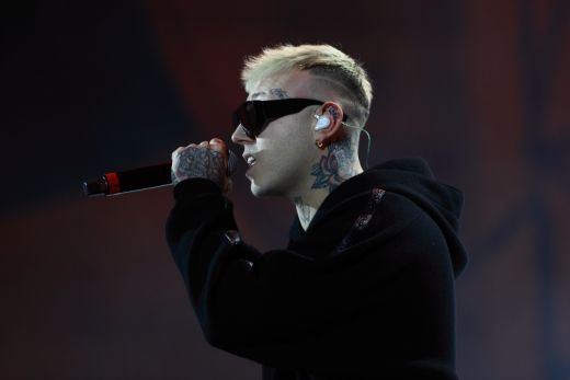 Rapper Lazza opens the event called "Tra Palco e città" at the Suzuki Stage, during the 74th edition of the Sanremo Song Festival. Among the songs sung also "Cenere", with which he ranked second last year. Rap music now represents a form of art, redemption and economic fulfillment for many young musicians in Europe and around the world. Photos are available for editorial use.