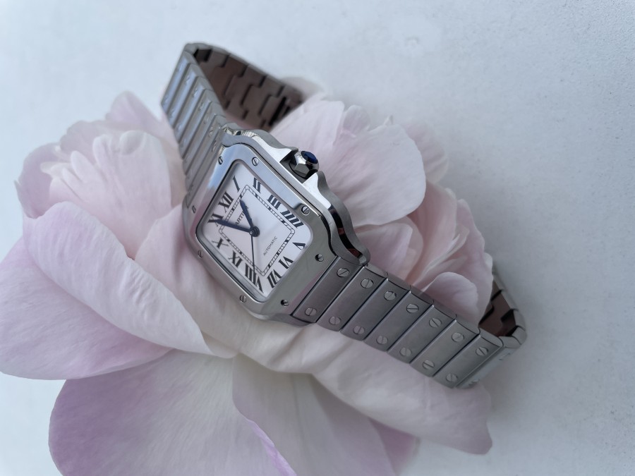 Und diese neuen Zeiten könnten noch schlimmer werden. Die kriegsbedingte Spirale von Börsencrash, Superinflation, weltweiter Armutszunahme und noch mehr Hungerkatastrophen erscheint immer wahrscheinlicher. Und deshalb, aber auch weil ein bisschen gute Laune in diesen dunklen Zeiten bitter nötig ist, möchte ich Ihr Augenmerk auf eine besondere Uhr lenken. Dass es für die Welt fünf vor zwölf steht, dürfte zwar auch jedem ohne Uhr klar sein, aber der Blick auf dieses wunderschöne Zifferblatt macht die bittere Wahrheit wenigstens jeden Tag erträglicher. Diese Modell Santos von Cartier gab es schon vor dem ersten Weltkrieg und wird es auch nach diesem Krieg noch geben. Diese Santos mit gewissen leichten Abwandlungen gibt es immerhin schon seit 1907. Seitdem wurden die Materialen und das Uhrwerk stetig weiterentwickelt, so dass diese Uhr heute zu den besten der Welt zählt.